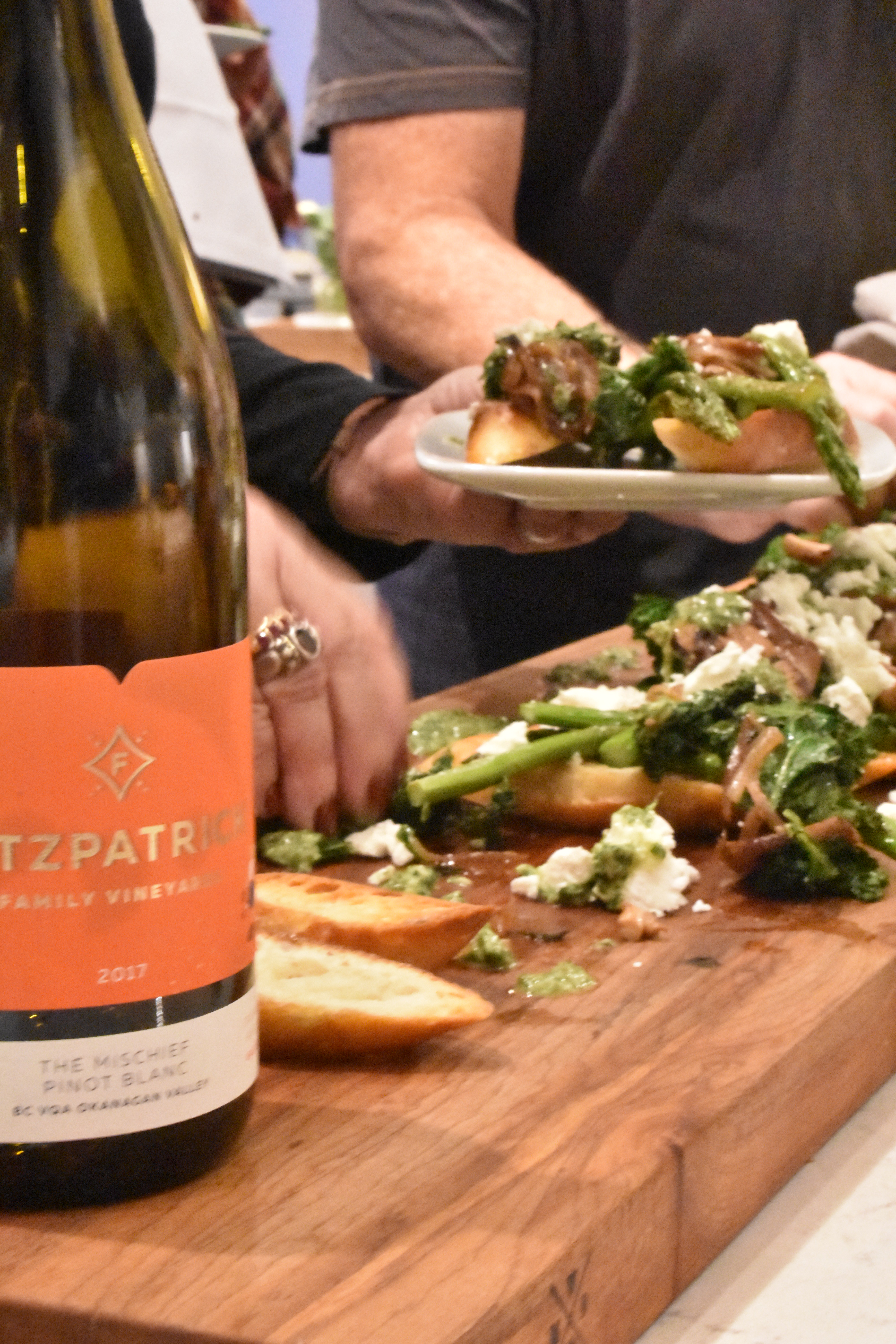 We began with the 2014 Vintage Brut Pinot Noir dominant bubble from Argyle Vineyards of Dundee, Oregon, and with the crostini, salsa verde, and roasted vegetables, we enjoyed the 2017 Pinot Blanc from Fitzpatrick Family Vineyards of BC’s Okanagan Valley.